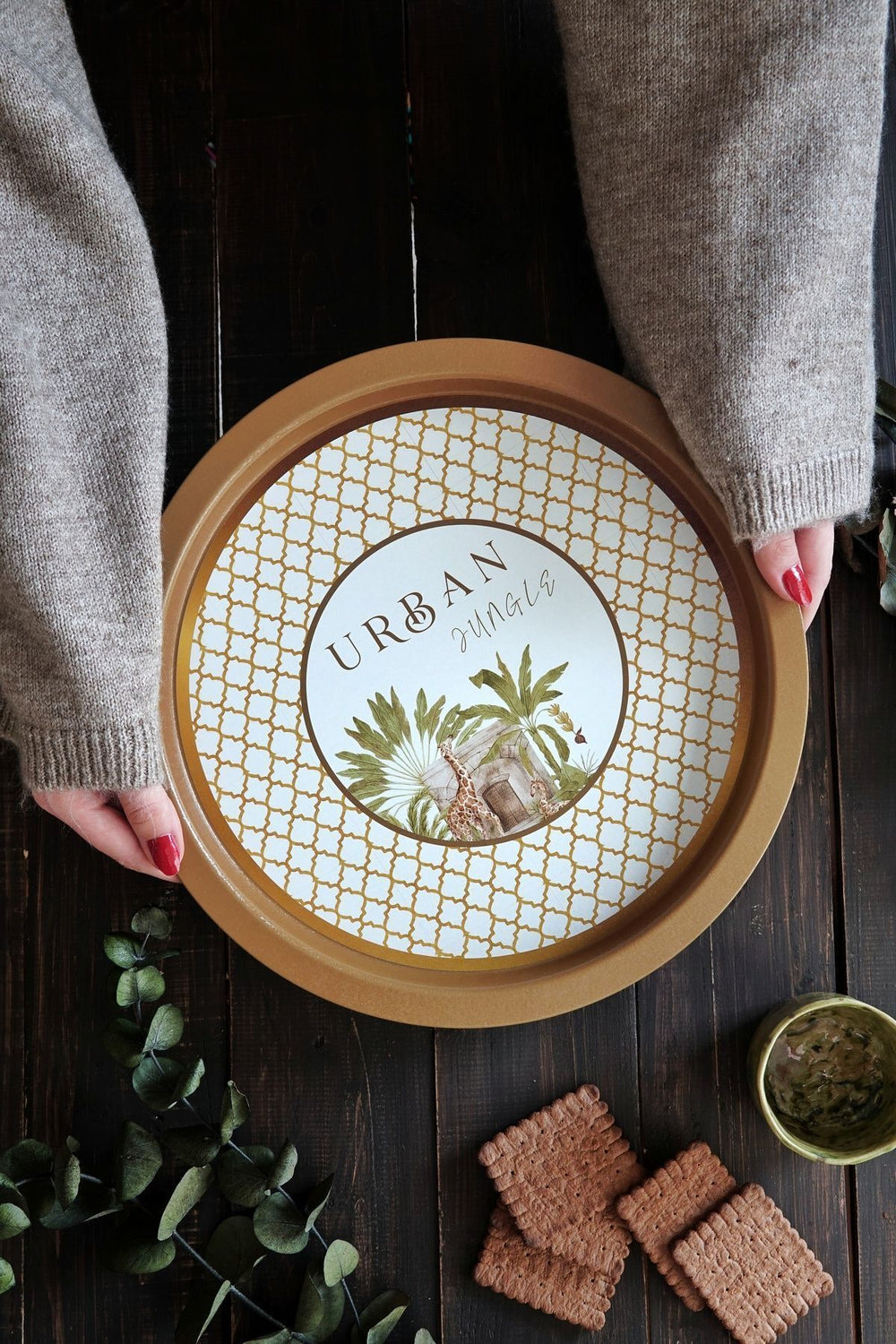 Evle yuvarlak metal tepsi, zarif ve sade tasarımıyla sofralarınıza şıklık katar. Çay servisi, kahve sunumu veya atıştırmalıklar için ideal bir kullanım sunar. Dayanıklı metal malzemesi sayesinde uzun ömürlü ve hijyeniktir.