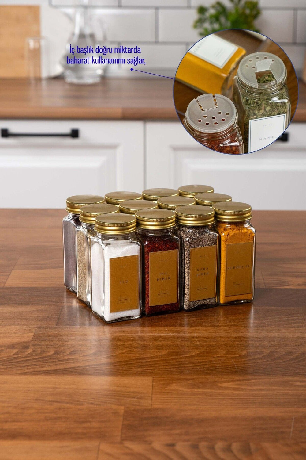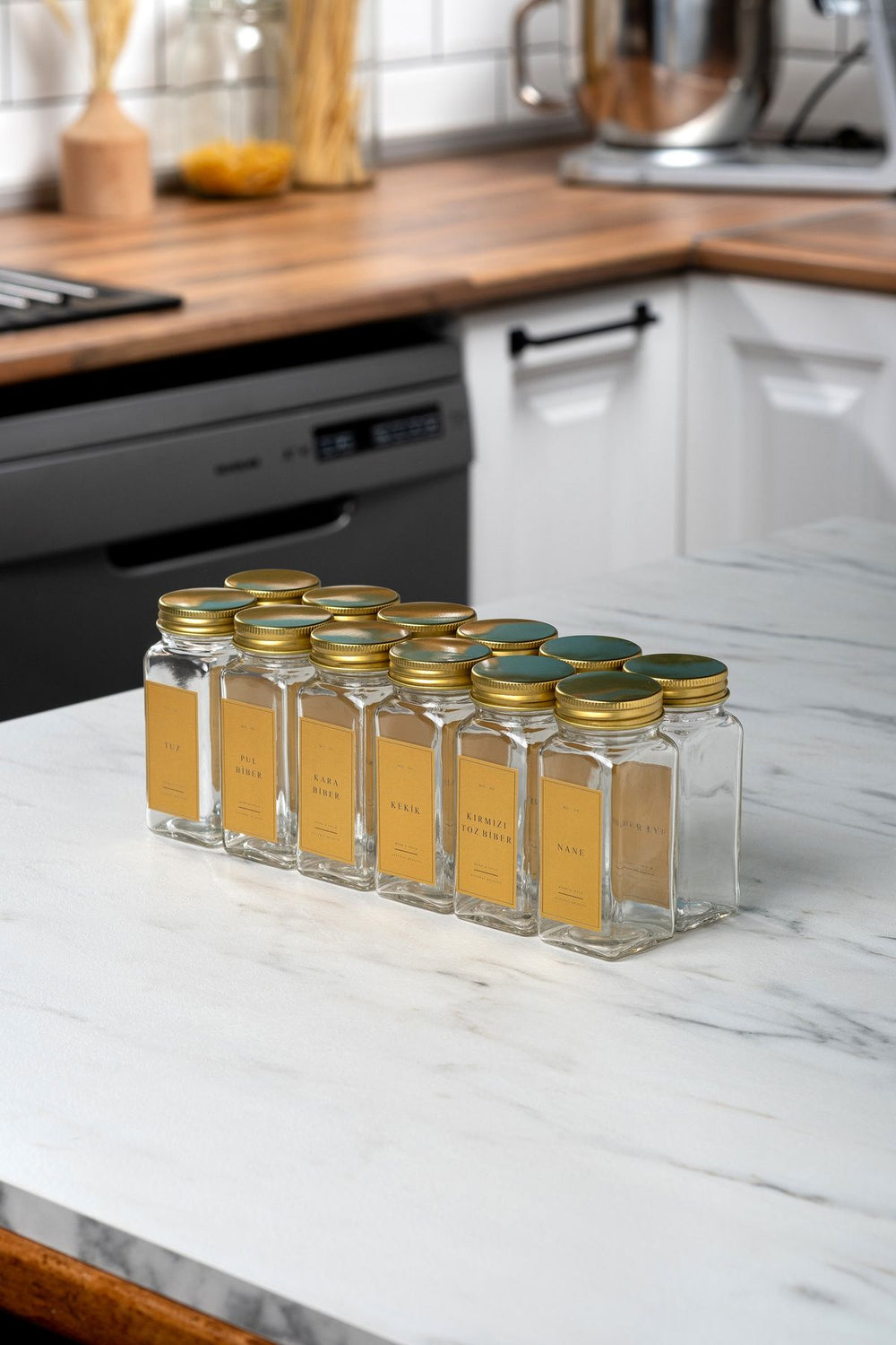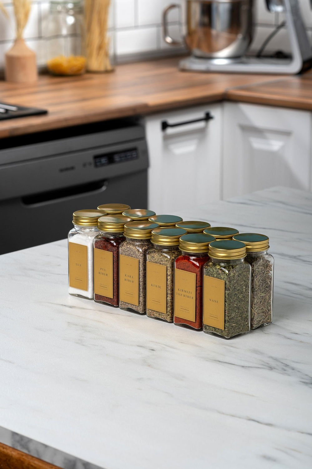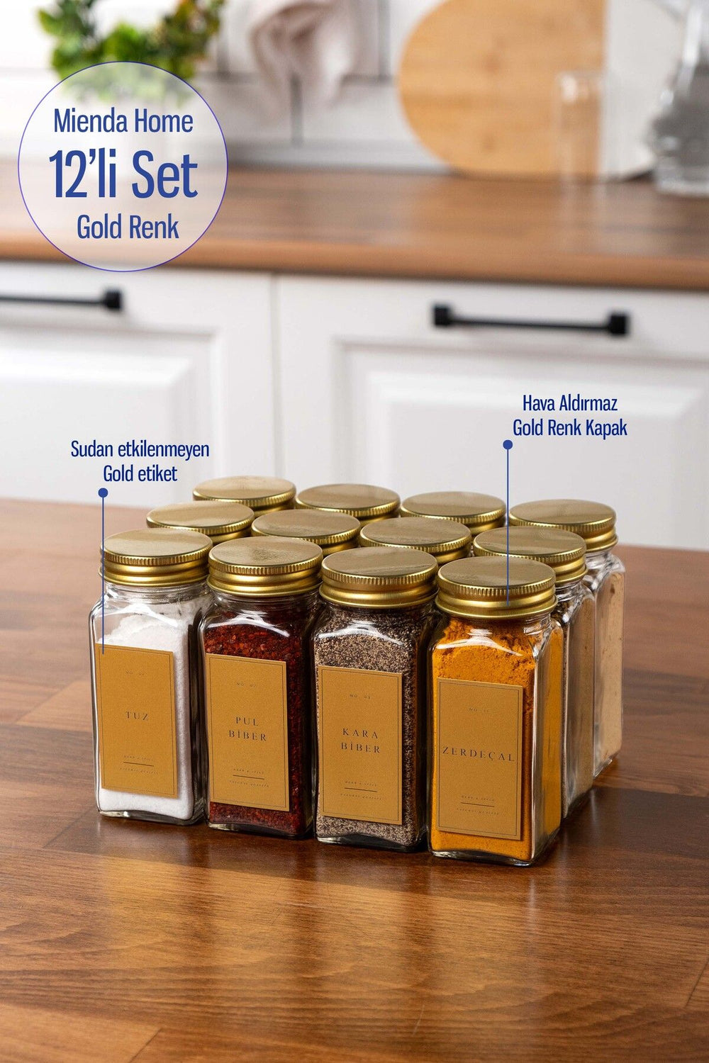 Bu set, mutfağınızda düzen sağlamanın yanı sıra, baharatlarınızı şık bir şekilde saklamanıza olanak tanır. Sudan etkilenmeyen etiketleri sayesinde, hangi baharatın nerede olduğunu kolayca görebilirsiniz. Gold renkteki estetik kapaklar, mutfak dekorasyonunuza zarif bir dokunuş katar.