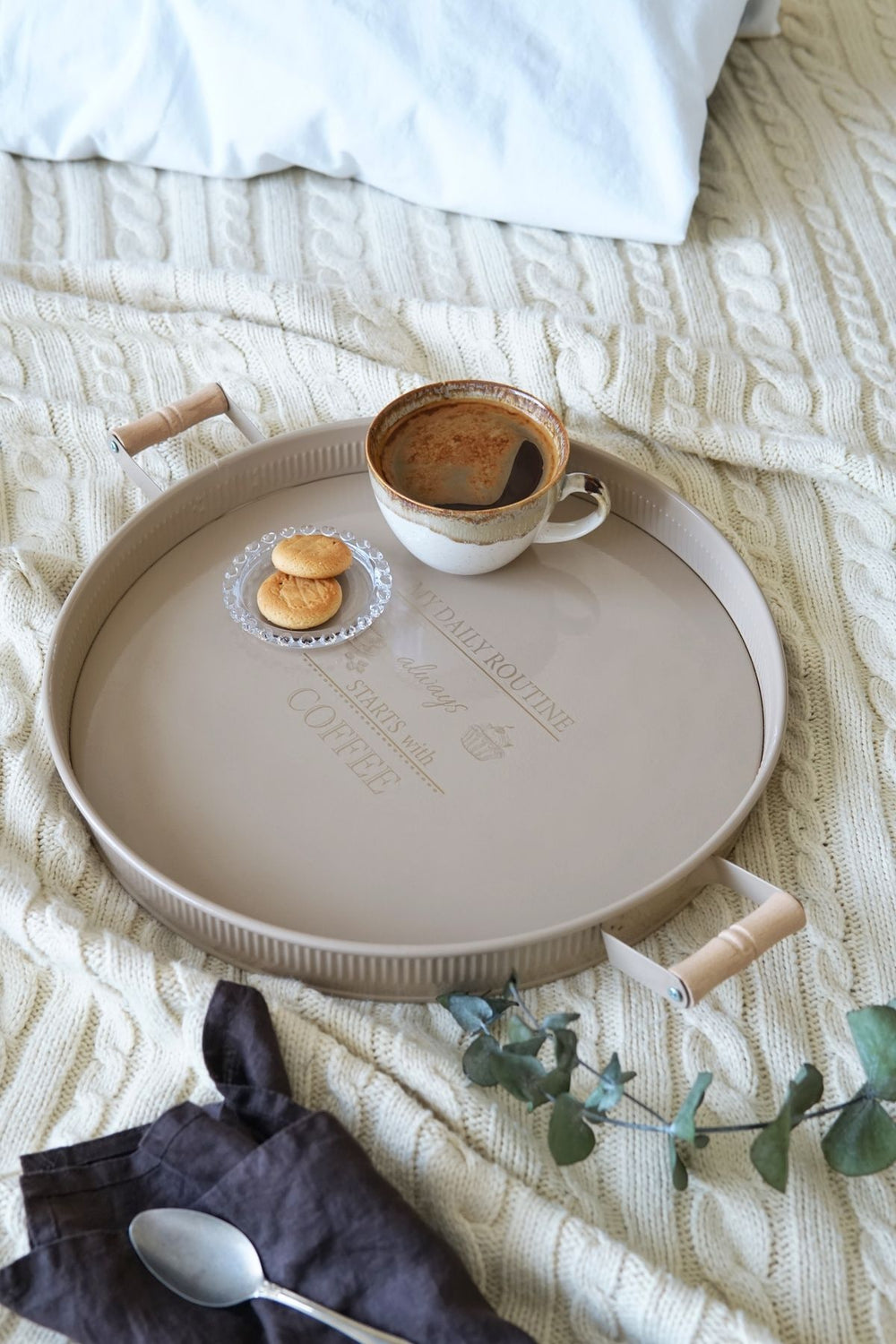 Ahşap kulplu yuvarlak tepsi, estetik tasarımı ve sağlam yapısıyla hem işlevsel hem de dekoratif bir üründür.