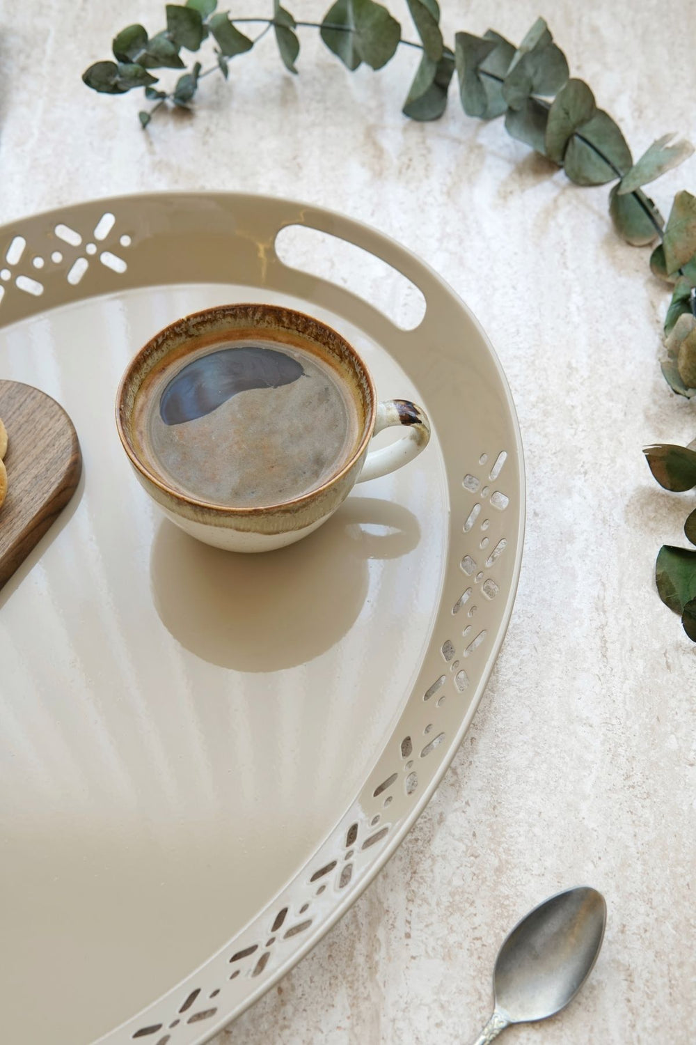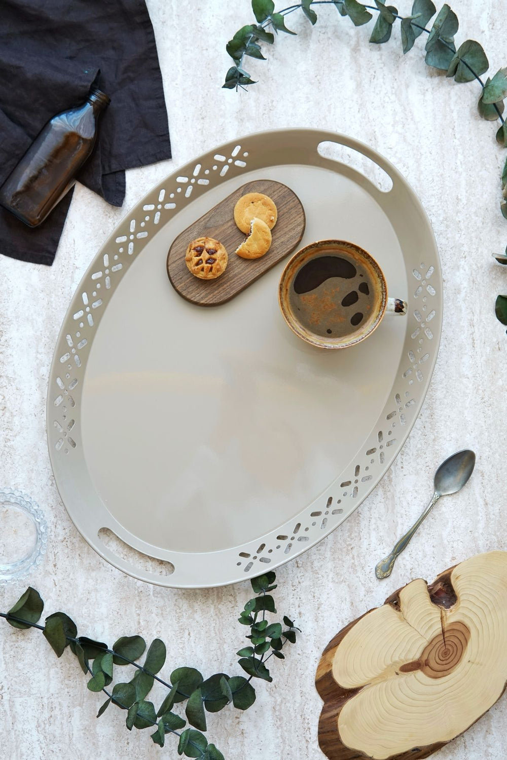 Metal Oval Servis Tepsisi, kahvaltıdan akşam yemeklerine, çay saatlerinden özel davetlerinize kadar birçok farklı kullanım alanında işlevseldir. Geniş yüzeyi sayesinde birden fazla fincan ve tabağı rahatlıkla taşıyabilir, estetik tasarımıyla masalarınıza zarif bir dokunuş ekler. Ayrıca, tepsinin kenarlarındaki delikli desenler, modern ve sofistike bir görünüm sunar.