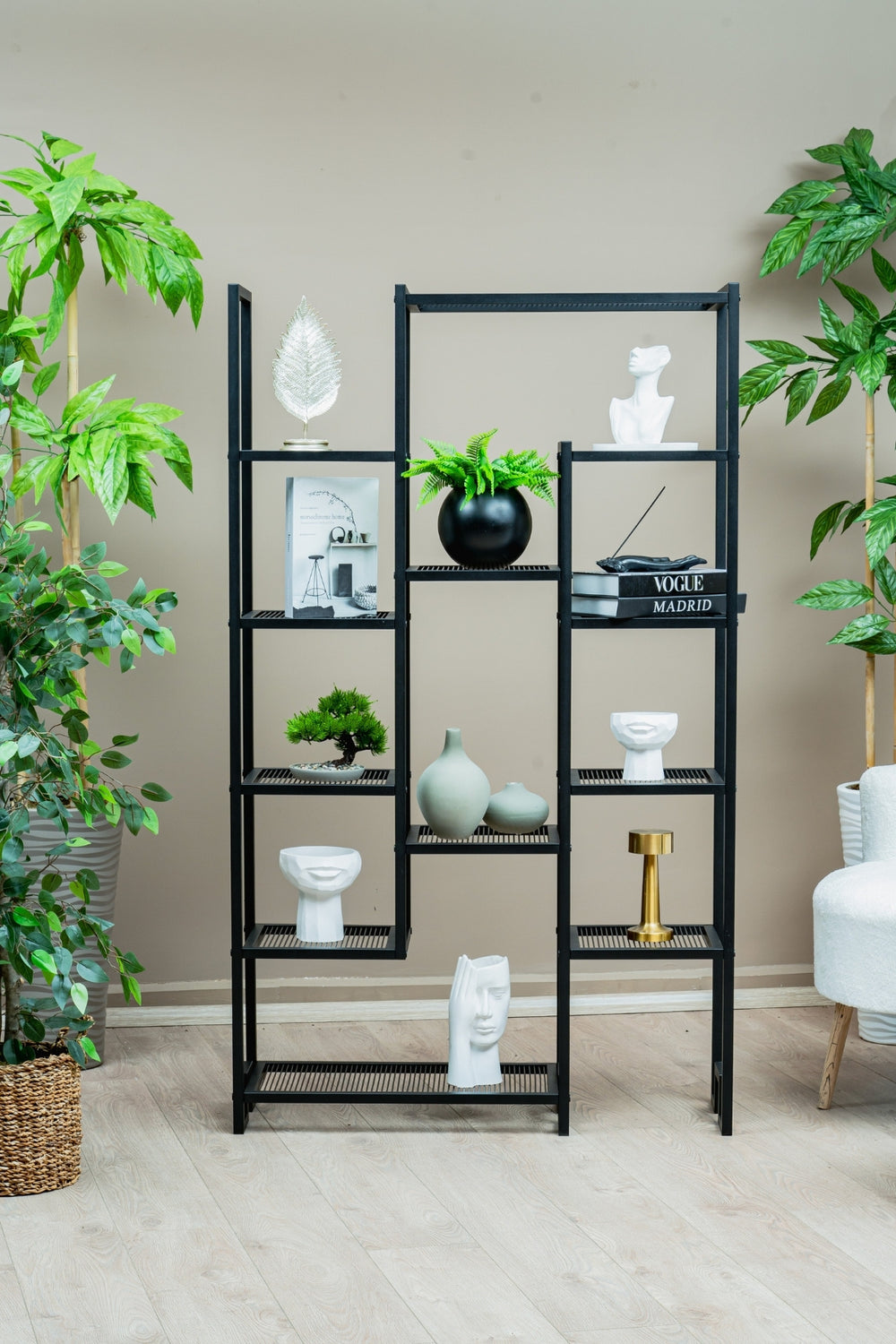 Evinize veya ofisinize sadece bir depolama çözümü değil, aynı zamanda modern bir sanat eseri ekleyin! Bu sıra dışı, asimetrik tasarıma sahip metal raf ünitesi, dinamik ve göz alıcı yapısıyla her türlü mekana anında karakter ve sofistike bir hava katar. Kitaplarınızı, bitkilerinizi ve en sevdiğiniz dekoratif objeleri sergilemek için mükemmel bir sahne sunar.