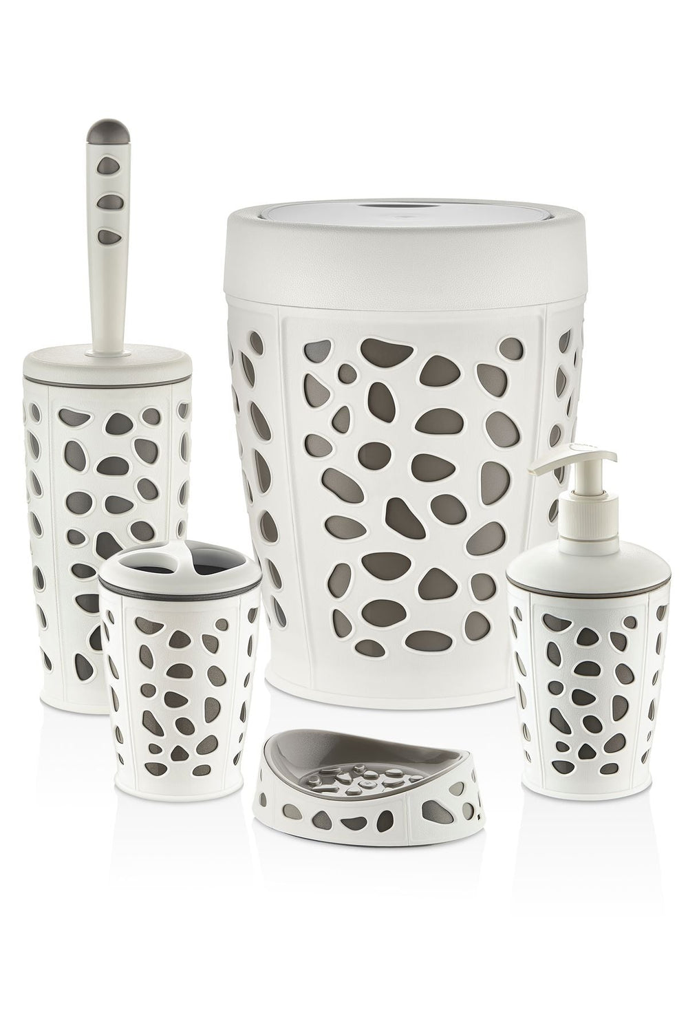 Dayanıklı plastik materyalden üretilmiş olup uzun ömürlü kullanım sunar; Kolay temizlenebilir yapısı sayesinde hijyenik bir banyo deneyimi sağlar; Modern tasarımı ile banyonuza şık bir görünüm kazandırır; 5 parçadan oluşan set, banyonuzda ihtiyacınız olan tüm parçaları tek pakette toplar;