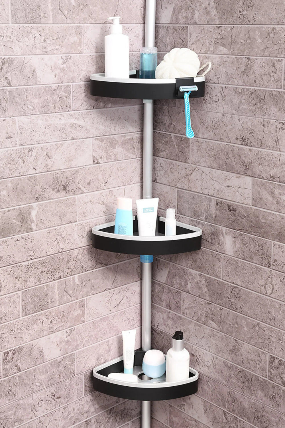 Primanova Banyo Köşe Seti Venta Siyah Yer ile tavan arasına sıkıştırılarak kurulur 260 cm e kadar tavan yüksekliğine uygulanabilir Montaj için vida ve delik gerektirmez Paslanmayan alüminyum borular 3 adet yüksekliği ayarlanabilen, ekstra derin raf (paslanmaz alüminyum aksesuarlar ile beraber)? Her rafa takılabilen 2 askı Şampuan şişelerini ters konumda tutabileceğiniz raf delikleri