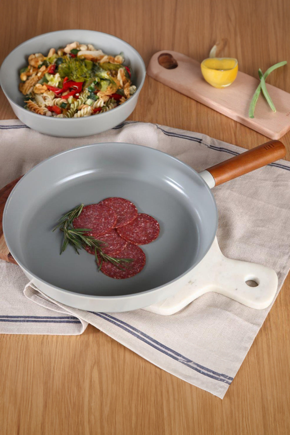 Fika Tava, zarif gri rengi ve ahşap dokulu sapı ile mutfağınıza şıklık katarken, ergonomik yapısı sayesinde kullanım kolaylığı sunar. Sade ve modern tasarımı, her mutfak dekoruna mükemmel uyum sağlar.