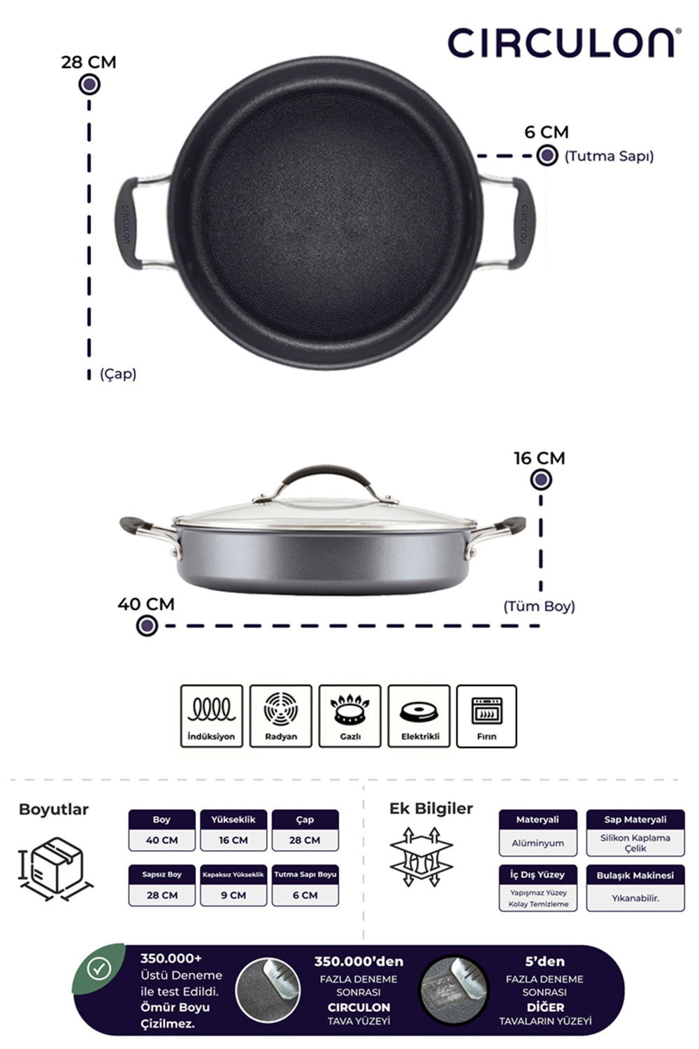 Circulon D-MYR228L Cırculon, 28Cm Cam Kapaklı Sığ Tencere, mutfak deneyiminizi baştan sona değiştirecek üstün özelliklerle donatılmıştır. Havacılık sınıfı dayanıklılık sunan ScratchDefense™ teknolojisi ile çizilmelere, yapışmalara ve aşınmalara karşı dirençli bu tencere, uzun ömürlü ve güvenilir bir kullanım sağlar.