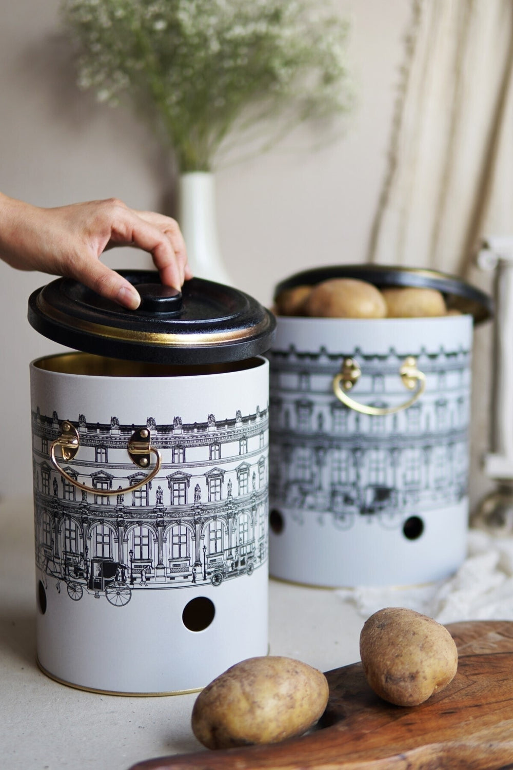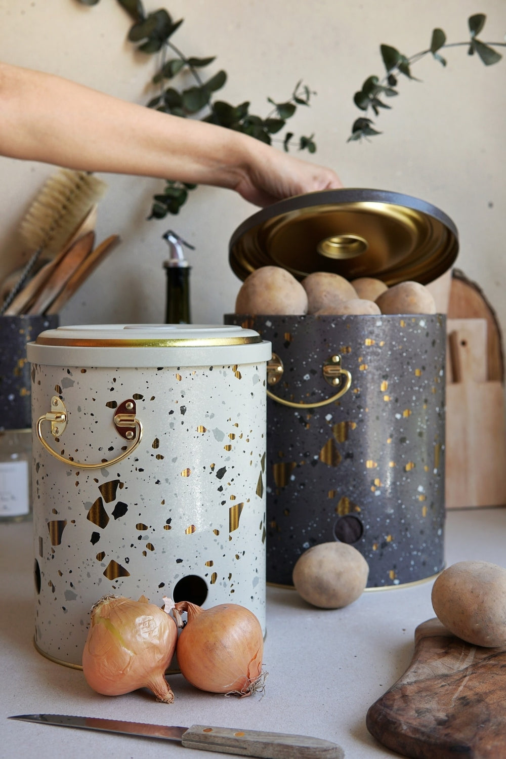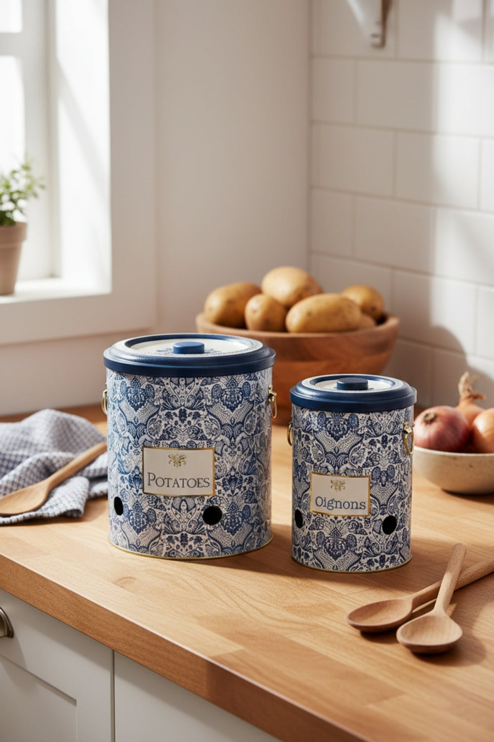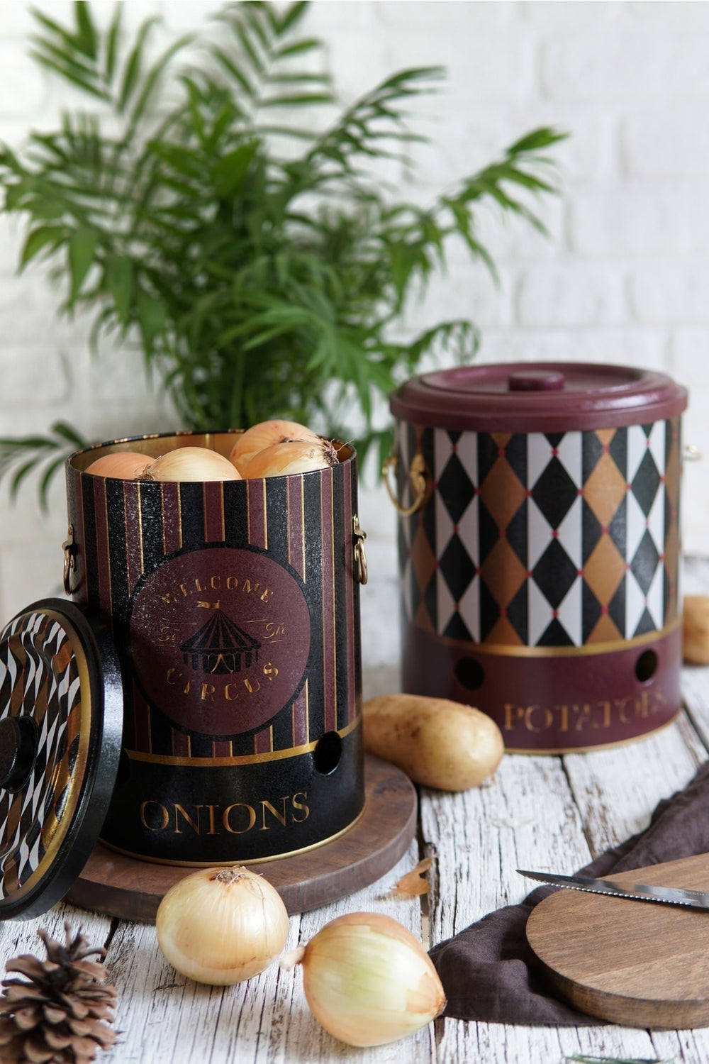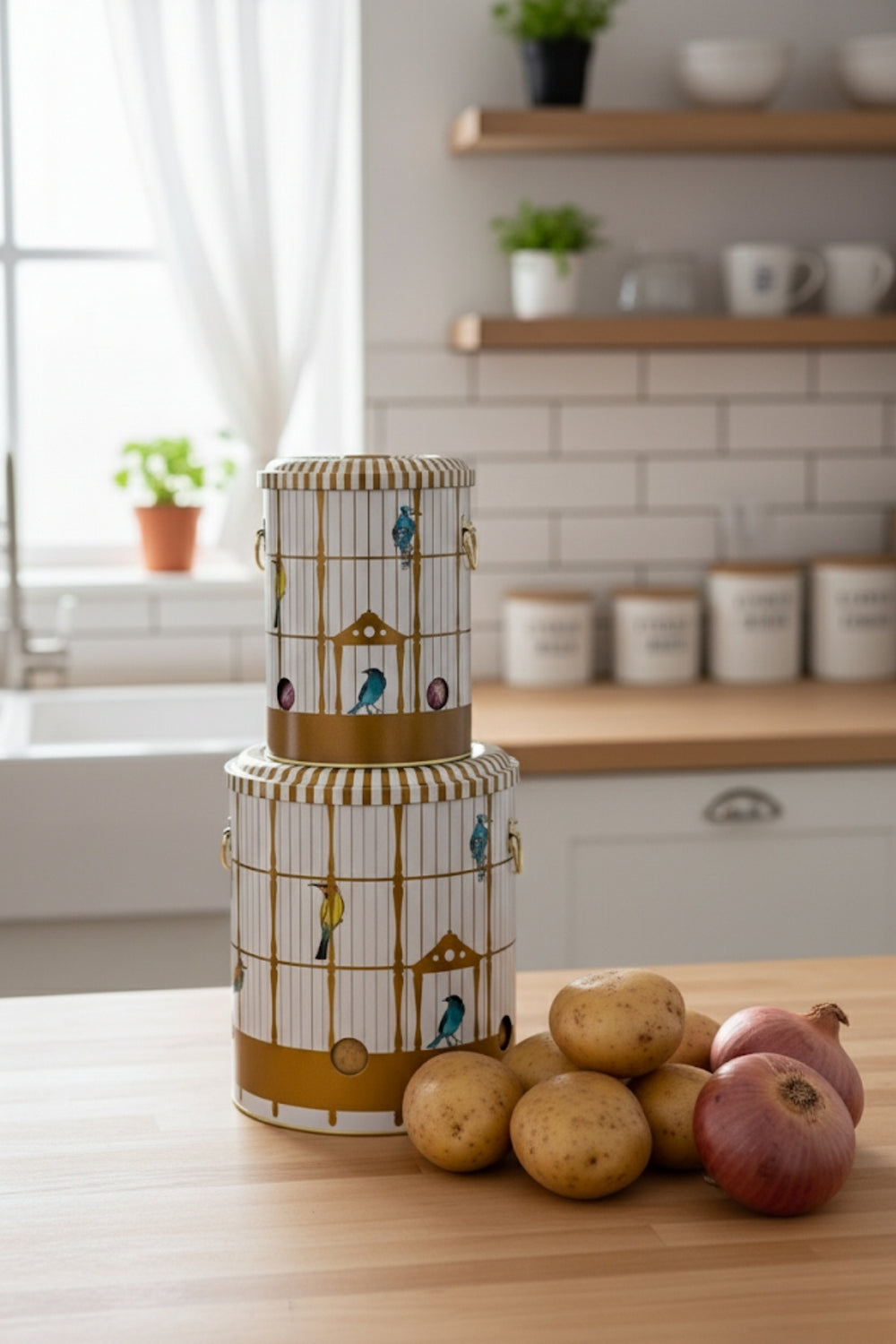 Patates Soğan Saklama Kabı 2’li Set Metal, mutfakta düzeni sağlamak ve sebzelerinizi sağlıklı koşullarda saklamak için ideal bir çözümdür. Metal yapısı ve havalandırma delikleri sayesinde patates ve soğanlarınız uzun süre tazeliğini korur. Şık tasarımıyla mutfak dekorunuza da uyum sağlar.